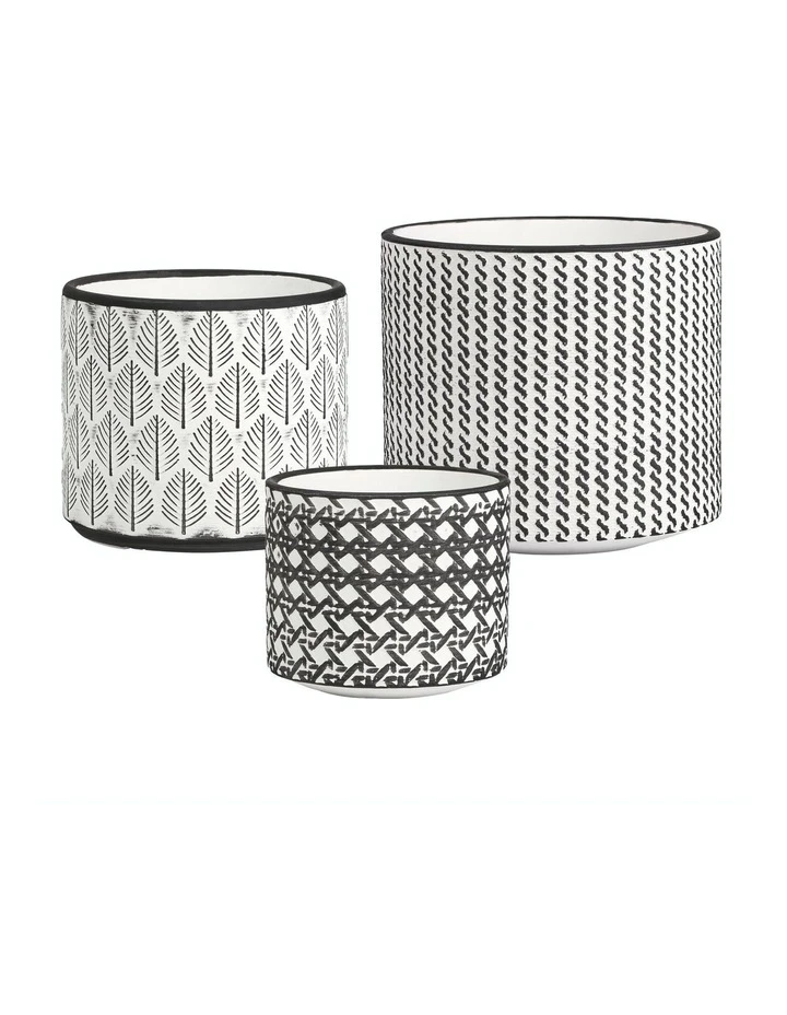 - Set includes three cylindrical pots in varying sizes perfect for placing your favourite.