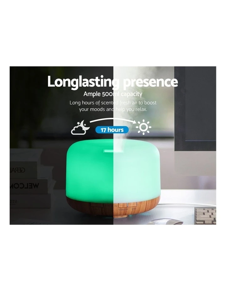 It uses electronic frequencies to create vibration in water. The resulting mist is then carried to the top where it absorbs the essential oils to purify the air and remove unwanted odours. At the same time, you experienced a scented aroma to calm and revitalize your body. You can set the aroma diffuser to work continuously for up to 17 hours by selecting its three timer functions. You also have a choice of two mist intensity levels. Not least, you can also adjust the level of brightness or select your desired night light colour with its 7-colour LED light to give you soothing hues all through the day or night.