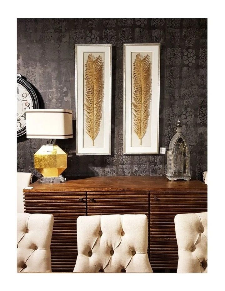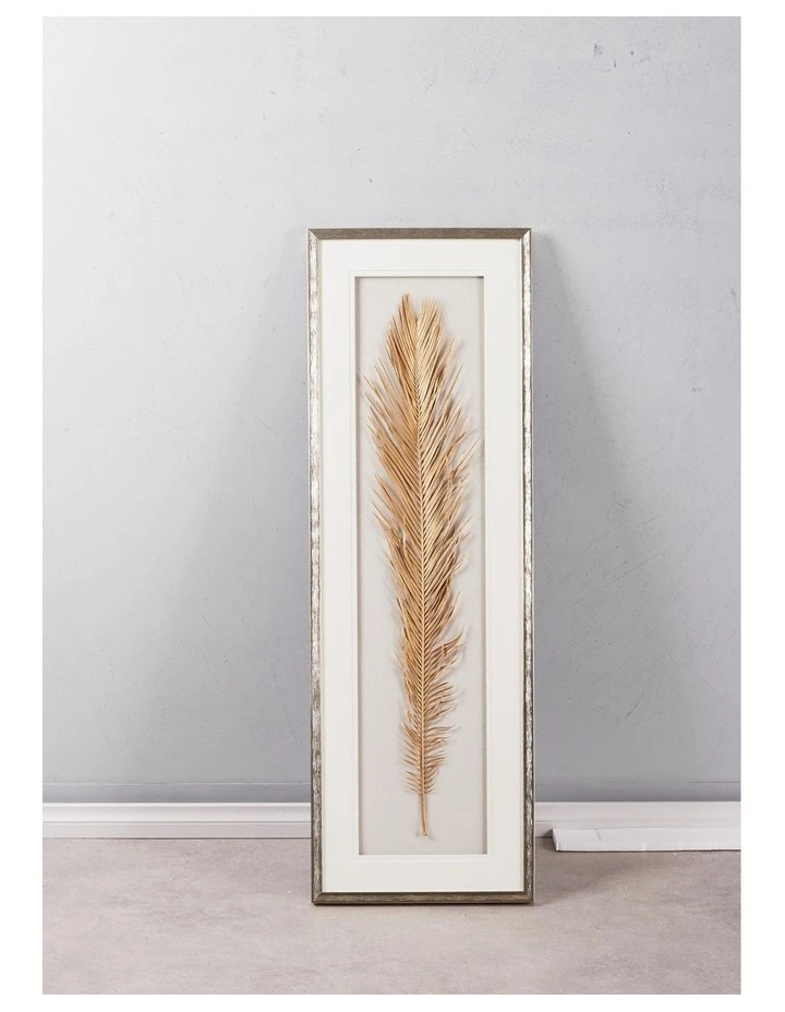 A stunning shadowbox featuring a long golden leaf. Looks great in a pair!
