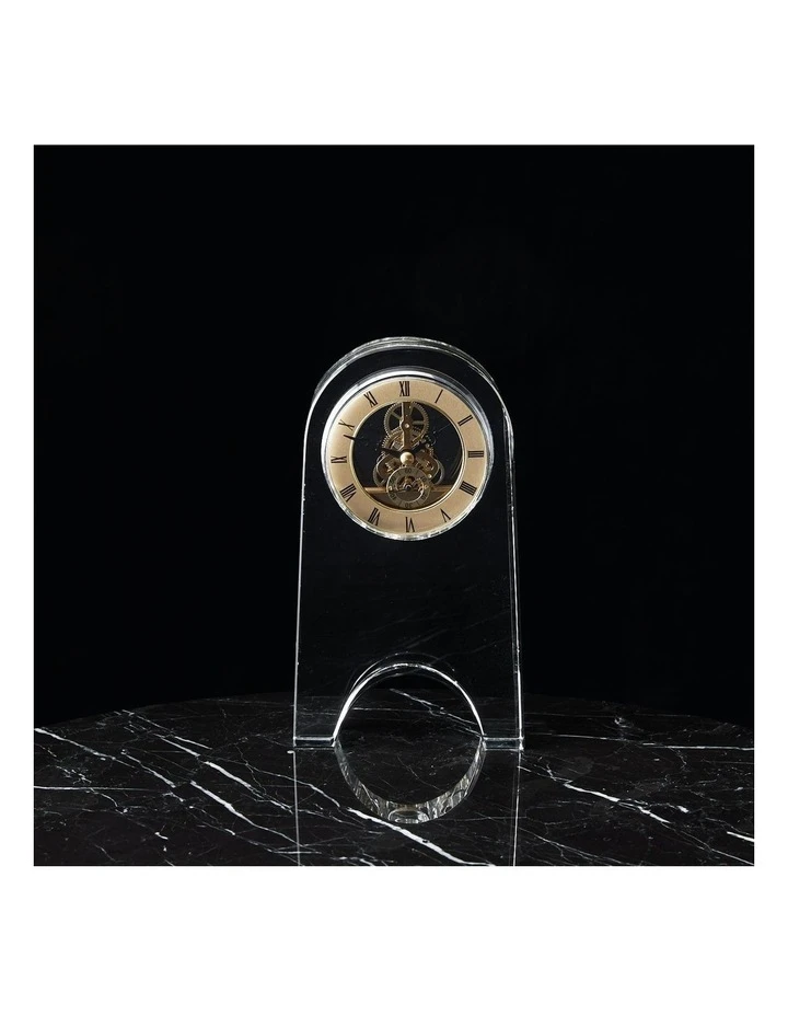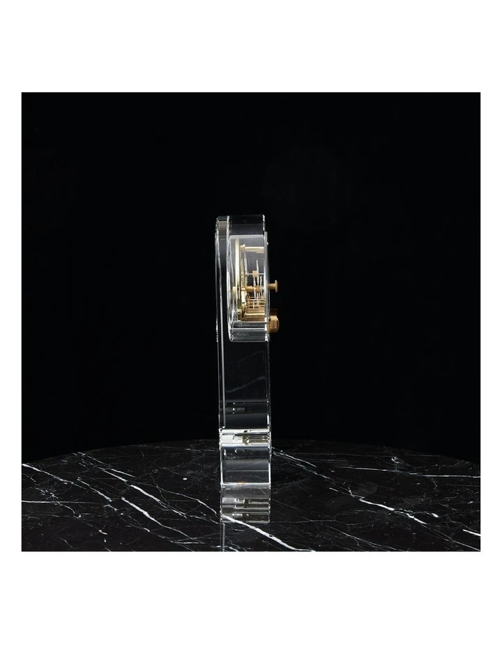 A gorgeous crystal clock with a golden clock face and roman numeral display.