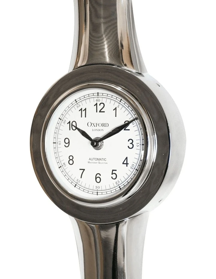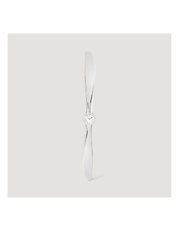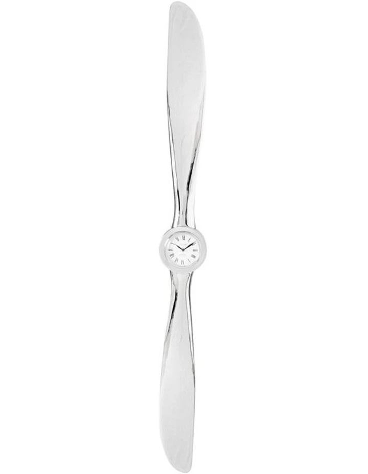 A truly unique clock with a long aeroplane design comprised of nickel.