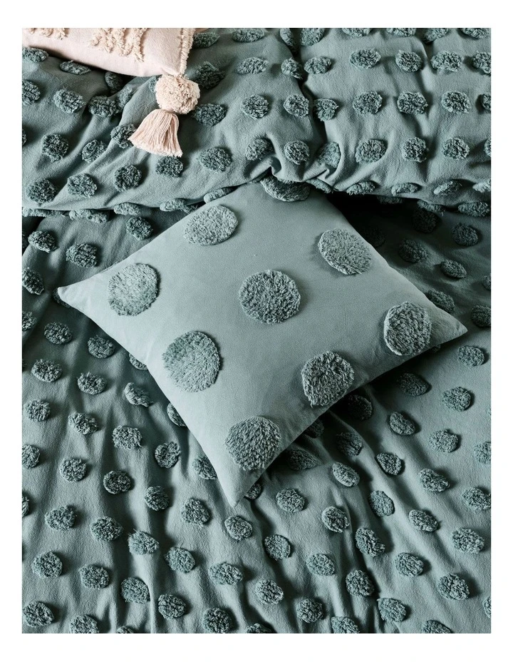 This chenille-spotted cushion in surf completes the nostalgic style of our best-selling bed linen, Haze.