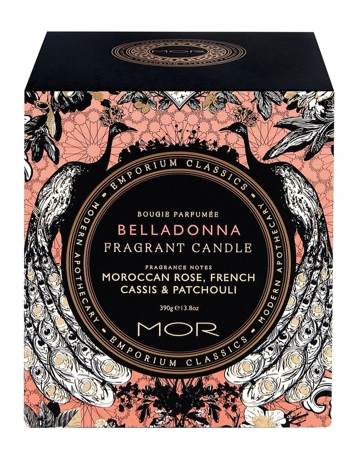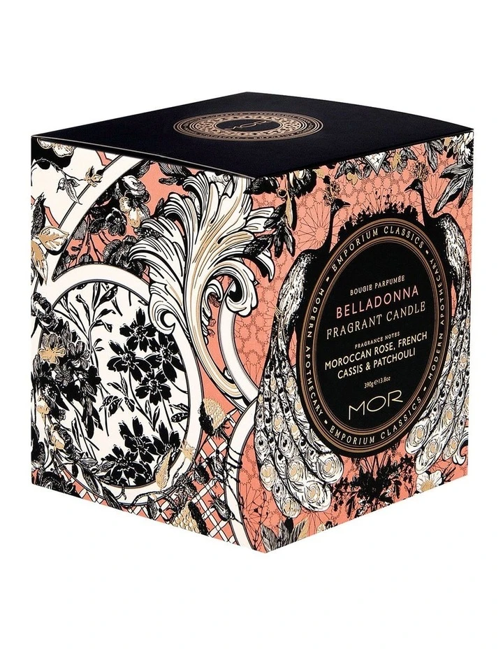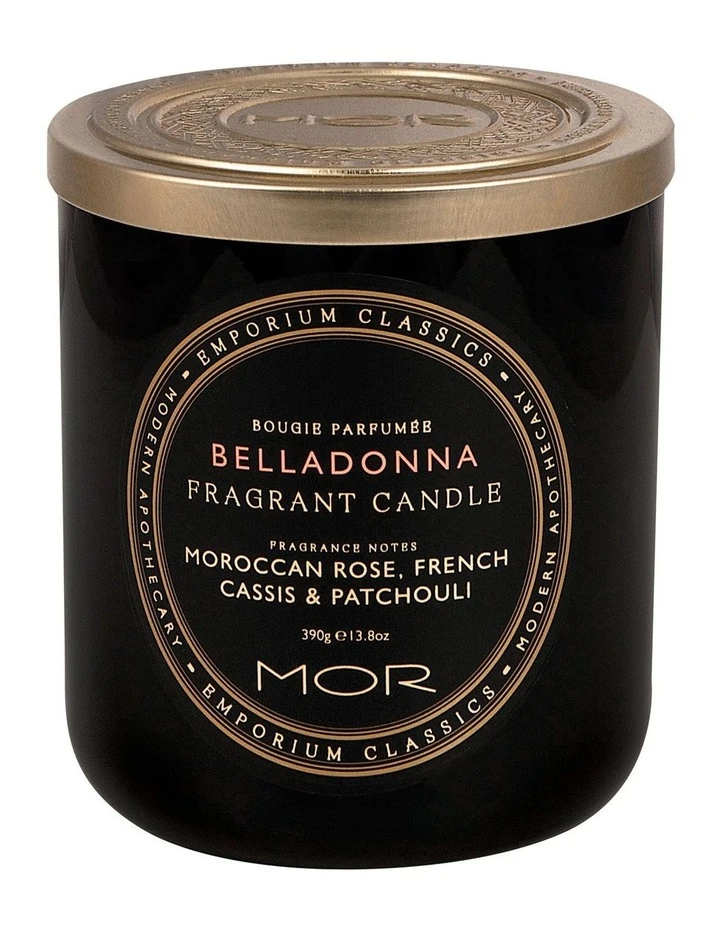 Lavish black Soy Wax is hand poured into an elegant glass vessel, complete with an adorned lid to exude a rich Belladonna fragrance and mood of opulence. Contains a 100% cotton wick and a 60 hour burn time