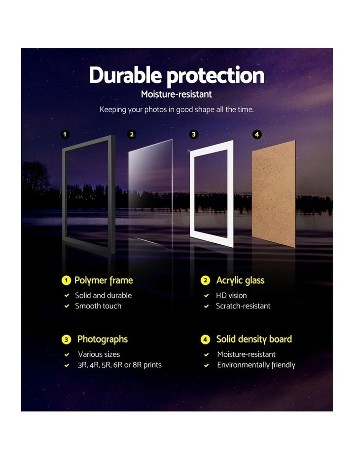 Every picture tells a story. And we are sure your extensive photo collection has lots to tell. So why not frame up the interesting ones on the wall and share the stories behind them to friends and family. You can do that beautifully with our charming Photo Frame Set. Available in a set of 30, our set allows your walls to be graced with fascinating stories and memorable moments from your treasured photographs. Arrange them in any way you like. Portrait or landscape, the framed photo feature wall is a conversational piece in its own right. Suitable for a range of photograph sizes from 3R to 8R, the frames feature a durable polymer construction with a high transparency acrylic glass to keep your prints in good shape. The hardboard backing is also moisture-resistant. Hanging accessories are also included with your purchase.
