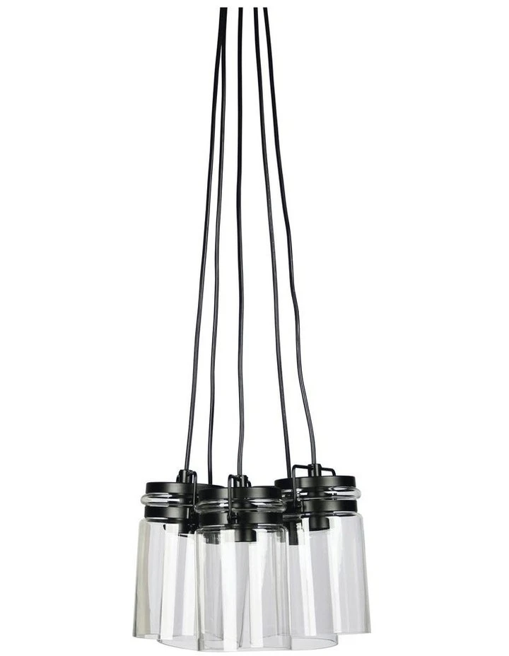 Ideal for use in a stairwell or entry, the AGAR clustered pendant is a neat addition to our retro-vintage range. The black metalware holds clear jars as they cluster together. We recommend clear globes (or carbon filament globes) are used in this pendant for the greatest effect. The glass ‘jars’ are open at the bottom. Also available in a single pendant.