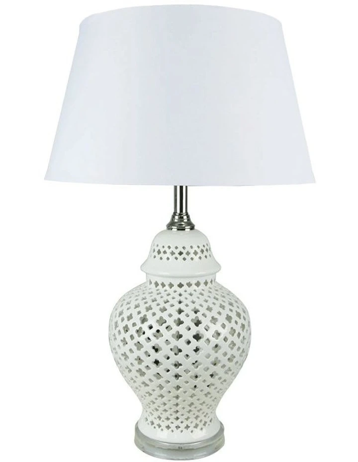 Gloss white ceramic lamp featuring a beautiful Moorish pattern. Supplied complete with shade, the Galla would look perfect in a living room as a feature lamp.
