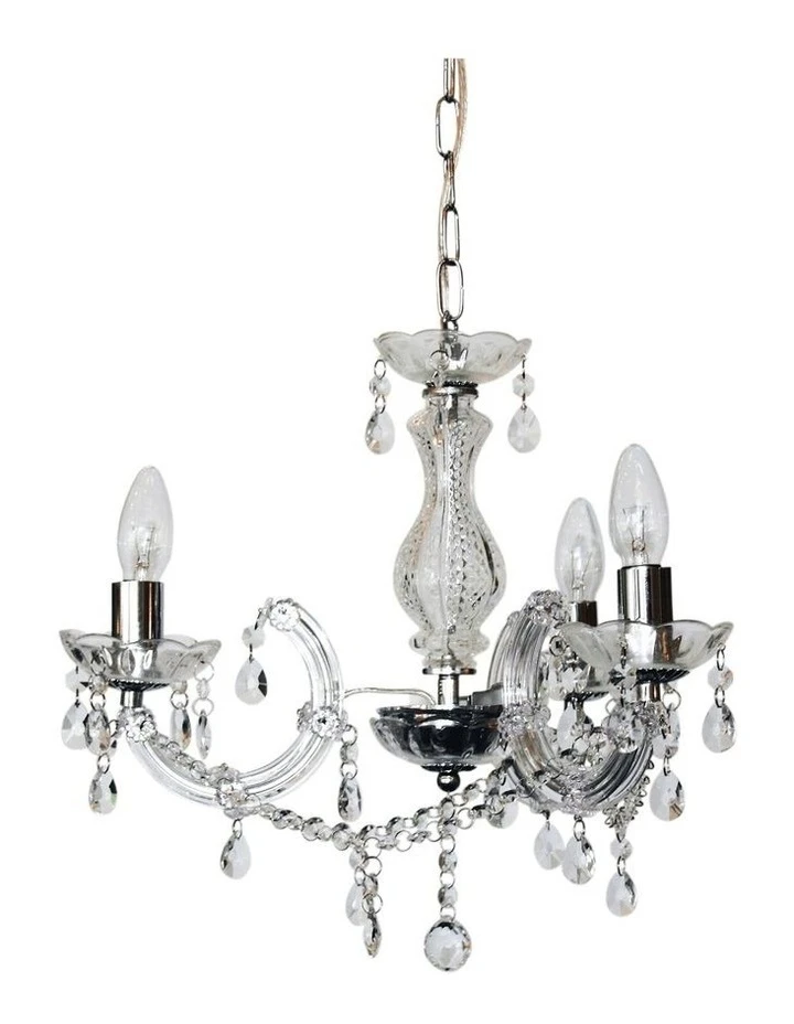 Attractive, classic clear glass and chrome 3 light chandelier style pendant. Also available in a wall light and a 5 light pendant. Clear candle shaped bulbs are recommended and sold separately.