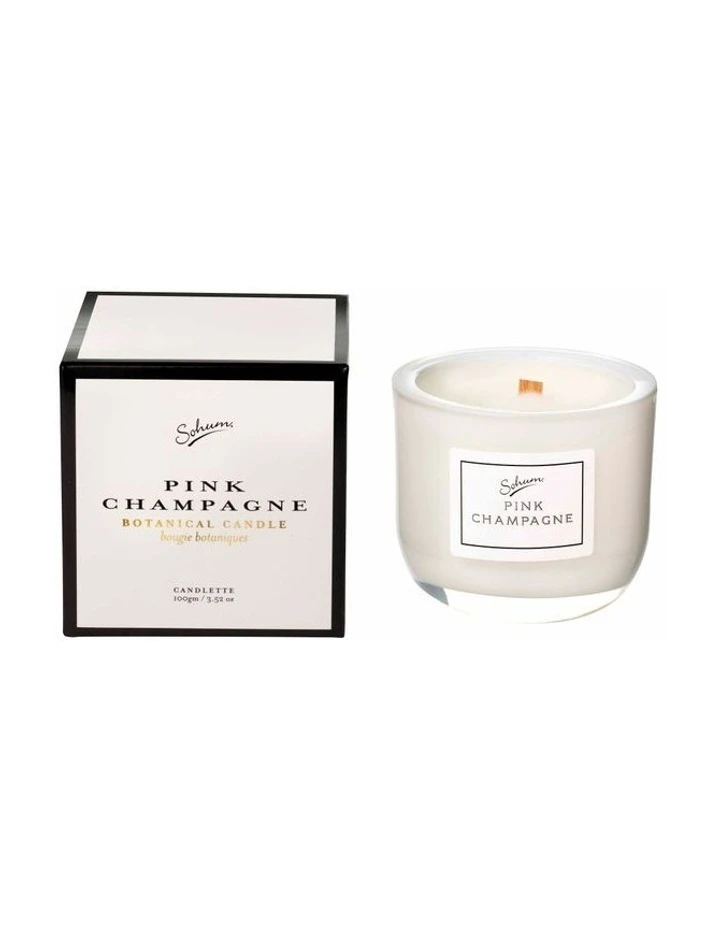 SOHUM Candlette made with botanical waxes induces a soft ambient glow infused with vivid fragrance for optimum burning. Pink Champagne Notes: Wild Strawberries, Black Currant, Gardenia, Musk, Rosewater.