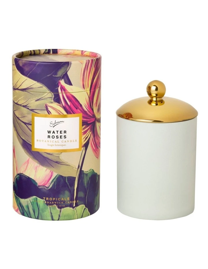 Sohum tropicale Candle in Water Roses, with notes of waterlily, iris, rock roses, violettes & pepperwood, mingled with vegetable wax and finished with a cedarwick for vivid fragrance & optimum burning, beautifully housed in a pure bisque vessel topped with a gold double glazed lid.