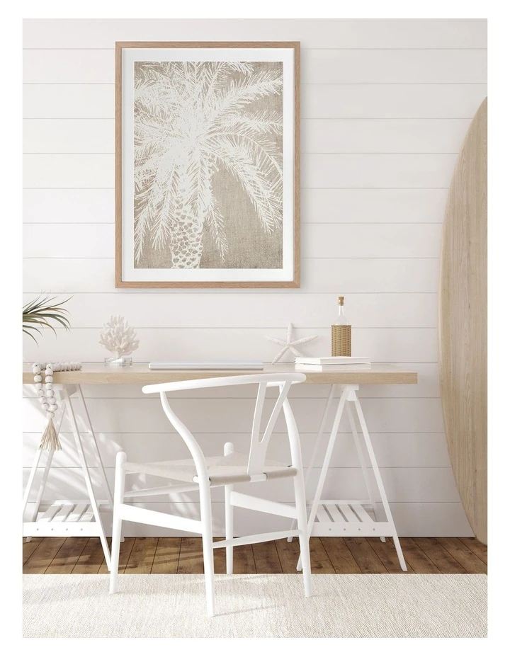 Canary Island I Print Oak Frame – A relaxed, tropical lino print style artwork that showcases a brilliant white impression of a Canary Island Date Palm splayed out against a textured, warm beige background. FRAMED ART: Giclee printed using archival inks and paper – which means no fading! Framed with a quality moulding and mounted behind museum grade plexiglass. Comes ready to hang.