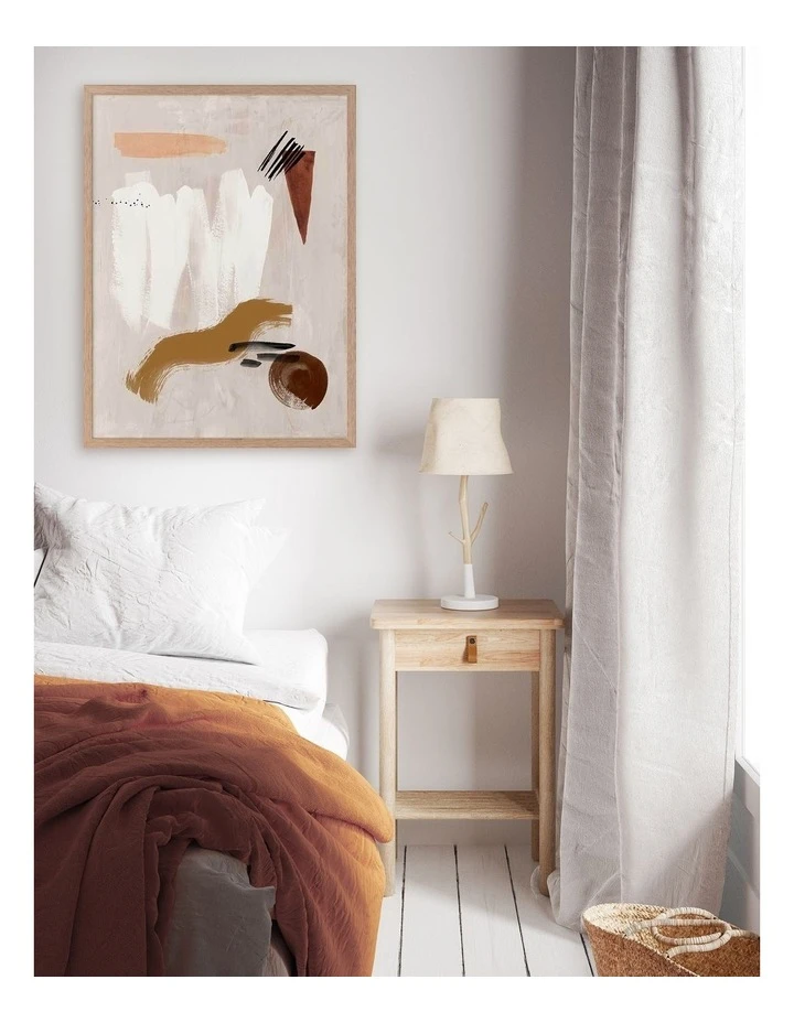 Dig Site I Framed Art Print – An earthy and grounded abstract artwork that features playful shapes, strokes and textures in shades of white, brown, peach and terracotta against a background wash of beige. Pairs with Dig Site II.FRAMED ART: Giclee printed using archival inks and paper – which means no fading! Framed with a quality moulding and mounted behind museum grade plexiglass. Comes ready to hang.