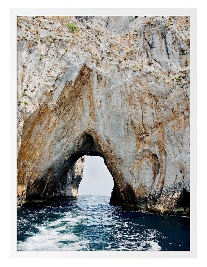 Grotto – Charm your space with this photographic art print of a brownish white limestone cave over the blue waters. Will the lonely yacht in the distance try to follow the initial vessel through this space? FRAMED ART: Giclee printed using archival inks and paper – which means no fading! Framed with a quality moulding and mounted behind museum grade plexiglass. Comes ready to hang.