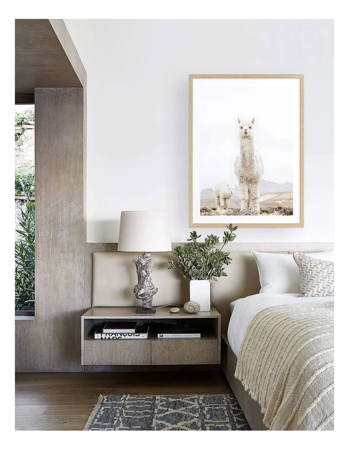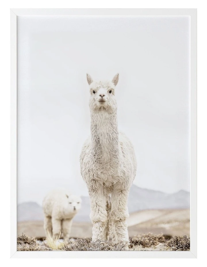 No Drama Llama – A photographic portrait of a white Llama and its baby in the wild.FRAMED ART: Giclee printed using archival inks and paper – which means no fading! Framed with a quality moulding and mounted behind museum grade plexiglass. Comes ready to hang.
