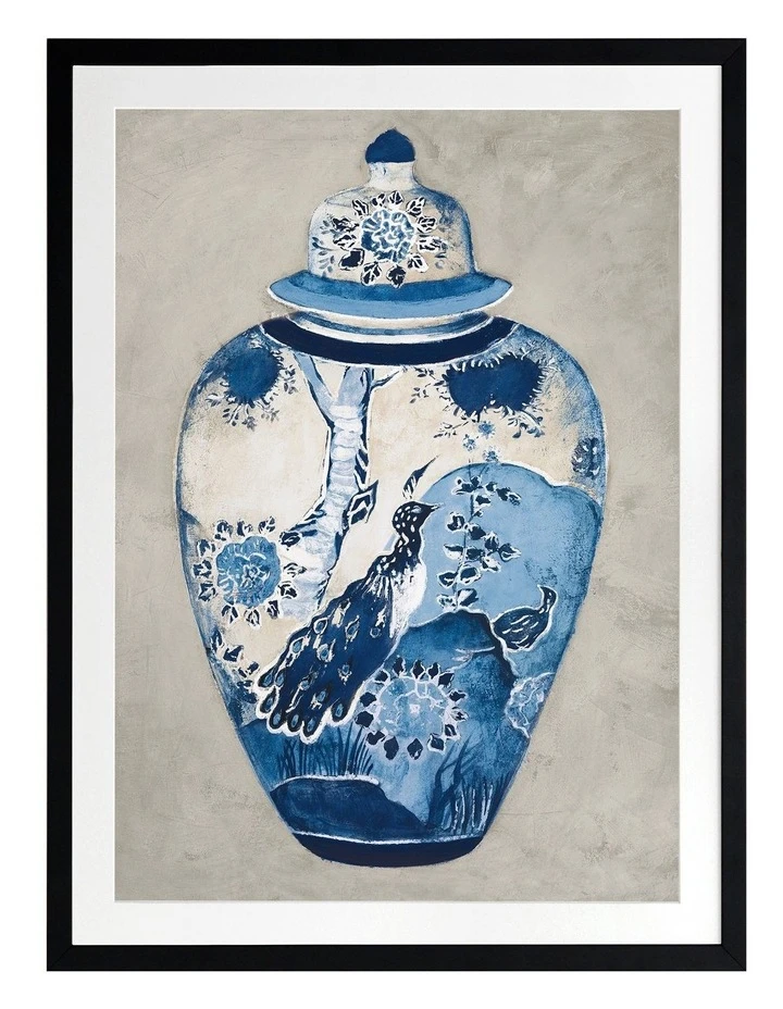 Orient II Print Black Frame – Quintessential Hamptons chic comes to life in this incredible art print featuring an intricately painted ginger jar. The blue and white jar features ornate, floral motifs, and is contrasted against a textured grey background. Pairs with Orient I.FRAMED ART: Giclee printed using archival inks and paper – which means no fading! Framed with a quality moulding and mounted behind museum grade plexiglass. Comes ready to hang.