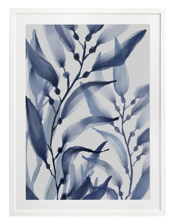Shelter Island I Print White Frame – This Hamptons style artwork features soft, delicate indigo blue watercolour sea grass moving across a soft grey background. Pairs with Shelter Island II.FRAMED ART: Giclee printed using archival inks and paper – which means no fading! Framed with a quality moulding and mounted behind museum grade plexiglass. Comes ready to hang.